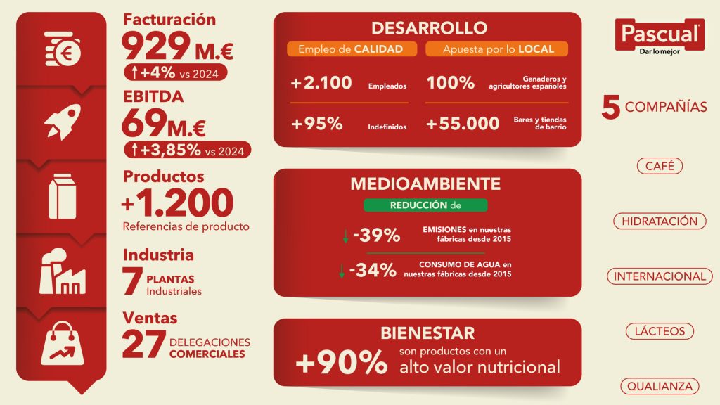 Pascual ha cerrado 2025 con 929 millones de euros de facturación (+4%), un EBITDA de 68,84 millones (+3,85%) y un beneficio de casi 20 millones de euros, un 30% superior al del año anterior, en un ejercicio marcado por la fuerte presión de los costes, sobre todo de las materias primas.